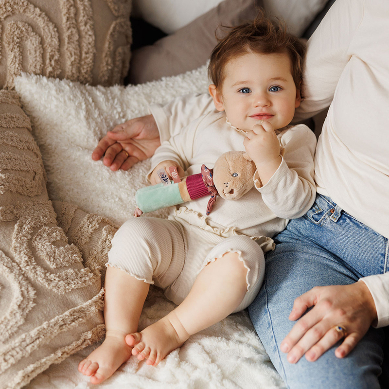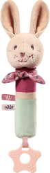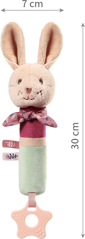 Forma alungită facilitează prinderea și transportul. Când copilul dumneavoastră apasă jucăria, aceasta emite sunete care implică auzul său și îl învață despre relația cauză-efect. Jucăria are un zornăitor cu diferite proeminențe care masează ușor gingiile. Culorile variate stimulează vederea, în timp ce urechile lungi, nodul și panglicile susțin feedback-ul tactil. Mânuțele mici pot prinde și explora, dezvoltând astfel motricitatea fină atât acasă, cât și în timpul plimbărilor.