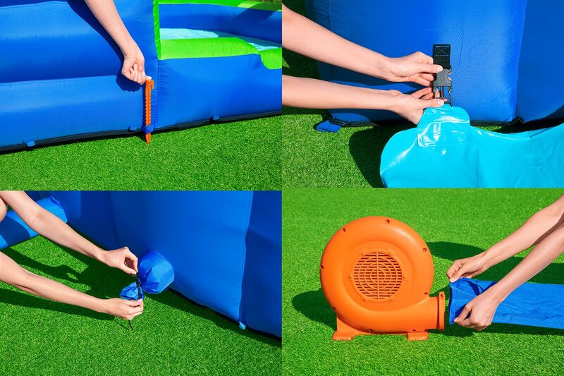 Parcul acvatic poate fi asamblat în doar 120 de secunde datorită ventilatorului puternic cu funcționare continuă. Ventilatorul certificat TÜV Rheinland asigură un flux constant de aer, astfel încât copiii se pot distra ore întregi.