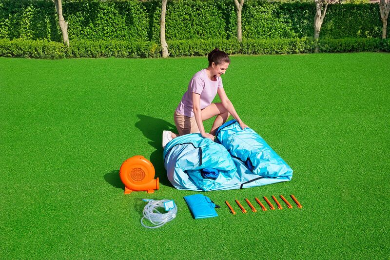 Mega parc acvatic Bestway® Turbo Slide vine cu un ventilator de calitate (220-240 V), care se fixează în siguranță cu ajutorul a două țăruși, o practică hârtie de apă, o geantă de ancorare și alte opt țăruși pentru asigurarea parcului acvatic. În plus, pachetul include o geantă de depozitare și un set de reparare cu diverse petice, pentru ca parcul acvatic să fie întotdeauna pregătit pentru utilizare.