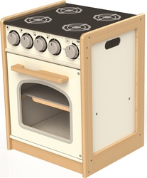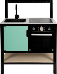 O bucătărie pentru micii bucătari de top. Cu aspectul său modern de bucătărie modular, care este accentuat de construcția elegantă a cadrului negru, această bucătărie de joacă din lemn atrage ochiul absolut. Detaliile inteligente fac bucataria si mai interesanta - un robinet de apa cu maneta pentru reglarea temperaturii apei, o chiuveta detasabila din plastic, un cuptor cu tava detasabila, apasarea butoanelor impreuna cu o ilustratie pe electrocasnice creeaza o experienta extrem de autentica. Include: tigaie o oală cu capac lopată clește pentru grătar Deci această bucătărie este gata de joacă imediat! Dulapul de sub suprafața de lucru, precum și cârligele pentru agățarea accesoriilor de bucătărie, sunt deosebit de practice și funcționale. Așadar, toate ustensilele de bucătărie pot fi aranjate îngrijit și păstrate la îndemână după joc. Un detaliu inteligent este partea de jos a raftului din dulap, care poate fi folosit și ca grătar pentru cuptorul din bucătărie. Partea stângă a dulapului poate fi folosită în mod flexibil ca frigider sau mașină de spălat vase. Datorita cadrului usor, bucataria din lemn este si usor de mutat, astfel incat poate fi schimbata in loc sa se joace. Este o bucătărie modernă pentru copii atrăgătoare din punct de vedere vizual, care oferă tot ceea ce tinerii bucătari de top au nevoie pentru a-și împlini imaginația. Caracteristici principale: conceput pentru a sprijini copiii în jocuri imaginative de lungă durată diverse zone de depozitare și depozitare bateriile nu sunt incluse in pachet promovează jocul de rol și abilitățile sociale Dimensiune: 56x30x72 cm Inaltimea suprafetei de lucru: 51 cm