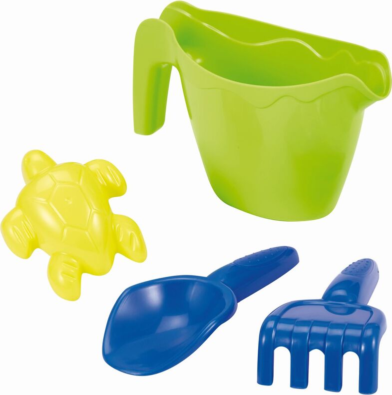 Mașinuță de transport cu o cană, greble, lopată și o formă pentru nisip.
