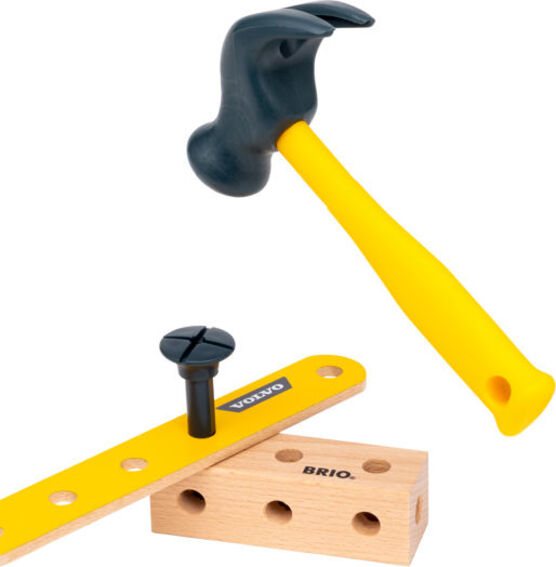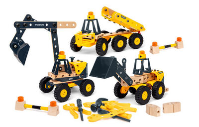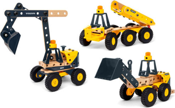 Setul de vehicule de construcție Volvo BRIO BUILDER include trei mașini emblematice Volvo cu funcții realiste și indicatori de baterie.