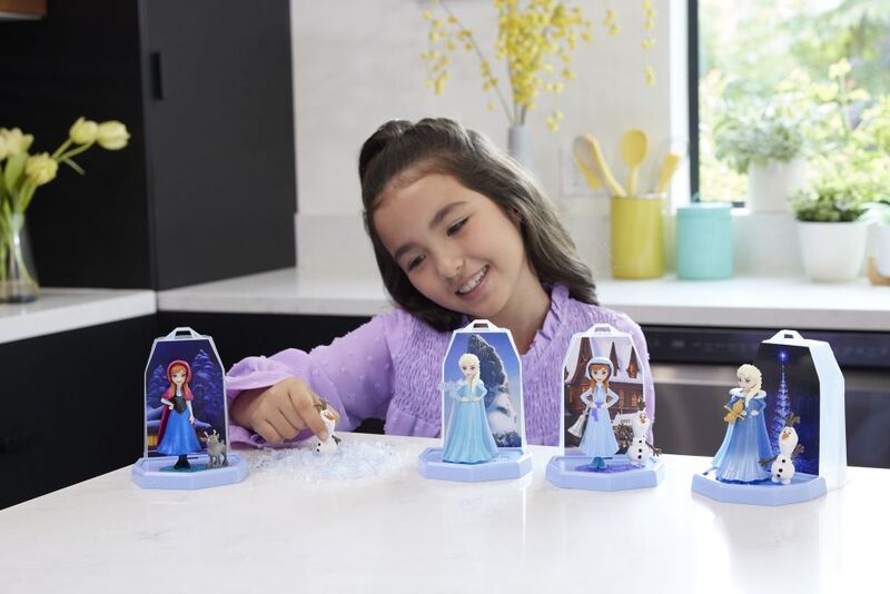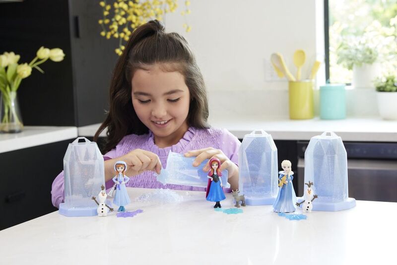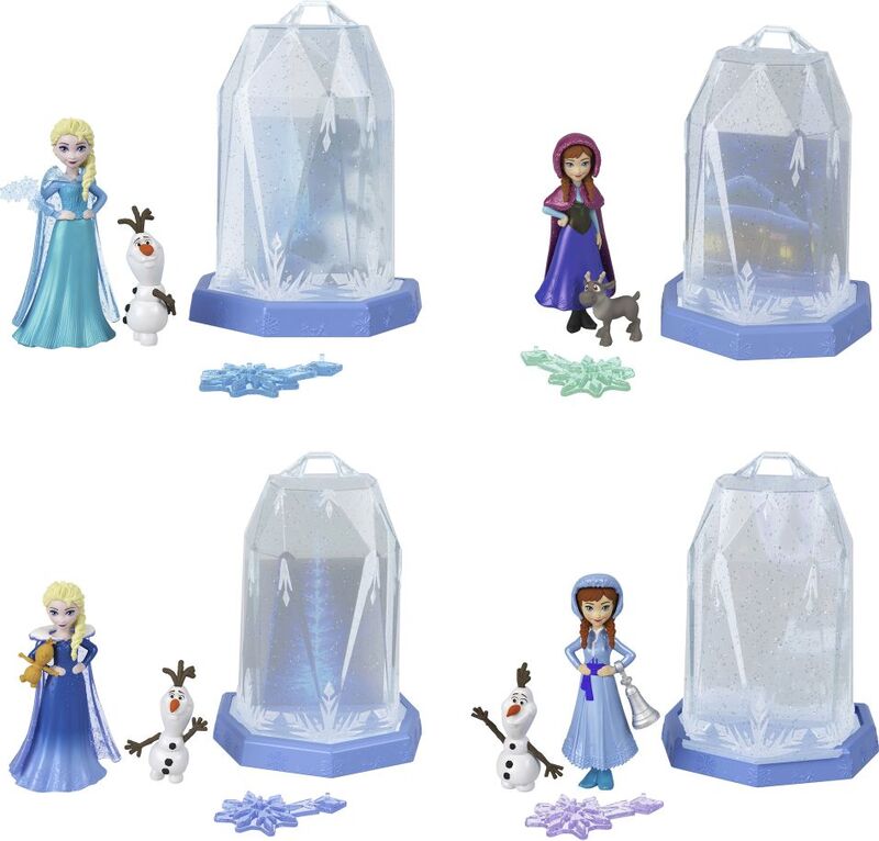 Fiecare set include o mică păpușă Anna sau Elsa cu o surpriză și un personaj preferat de fani - Olaf omul de zăpadă sau Sven renul în copilărie.