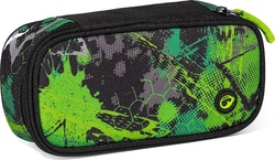 Trusă verde și neagră pentru școlari și școlari mici. Paravanul dublu are bucle de cauciuc pentru papetărie, alte unelte pot încăpea în spațiul de sub despărțitor. Se inchide convenabil cu fermoar cu o singura tragere.
