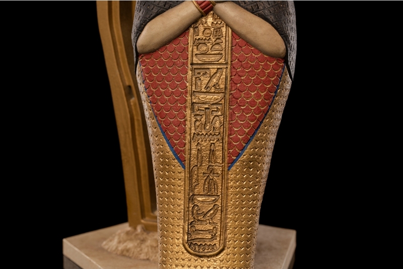 - Include un sarcofag antropomorf cu elemente detaliat sculptate și colorate.