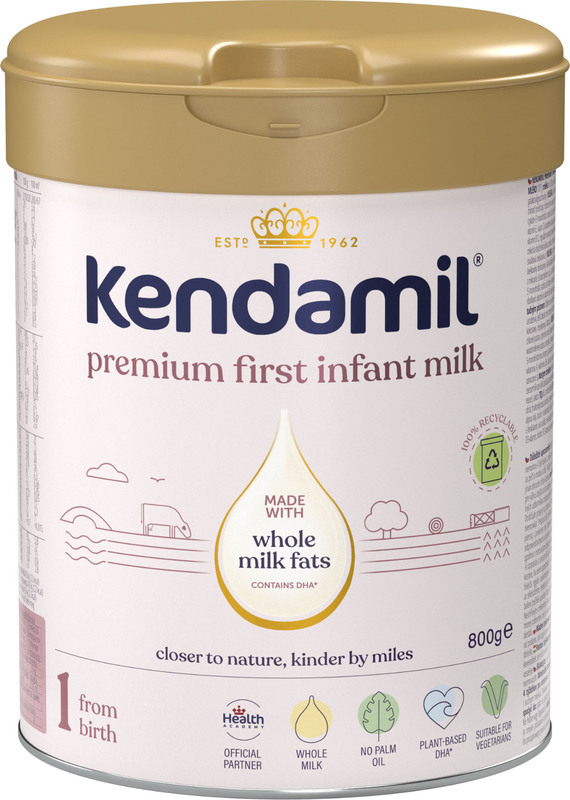 Noua și îmbunătățita compoziție a acestui lapte este rezultatul a 60 de ani de cercetare și dezvoltare. Laptele pentru sugari Kendamil este inspirat din cele mai bune lucruri din natură. Baza sa este în principal laptele de vacă integral. Este destinat copiilor de la naștere până la 6 luni, dacă nu pot fi alăptați. Ambalajul este complet reciclabil.