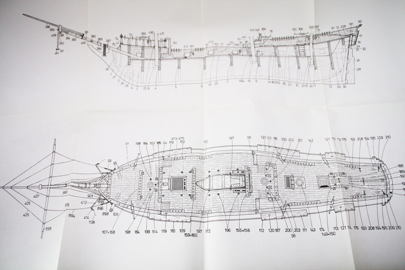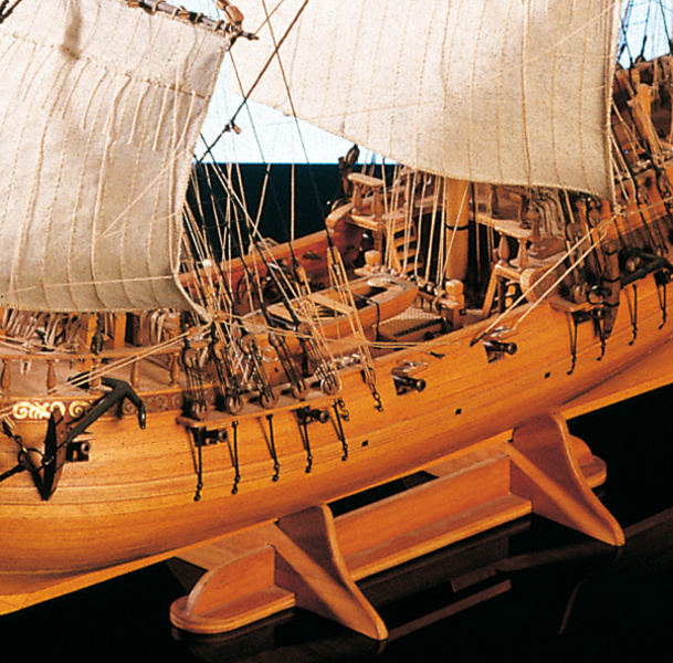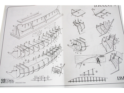 Pachetul conține un set de piese din placaj, un set de bare din lemn cu secțiuni diferite, un blister cu piese mici, piese din alamă, steaguri, un set de desene și un manual multilingv.