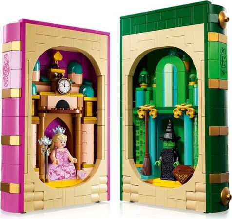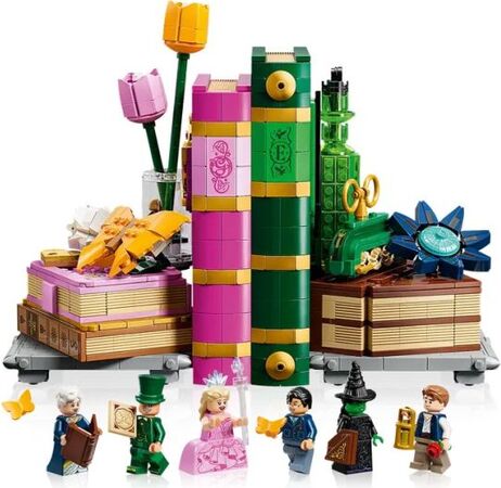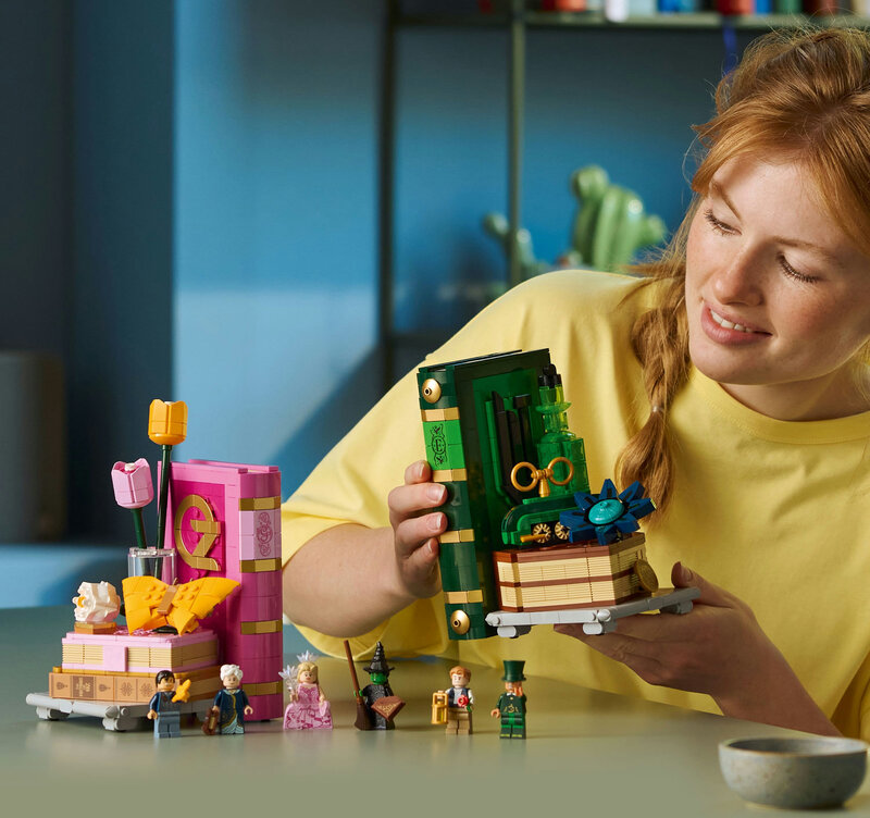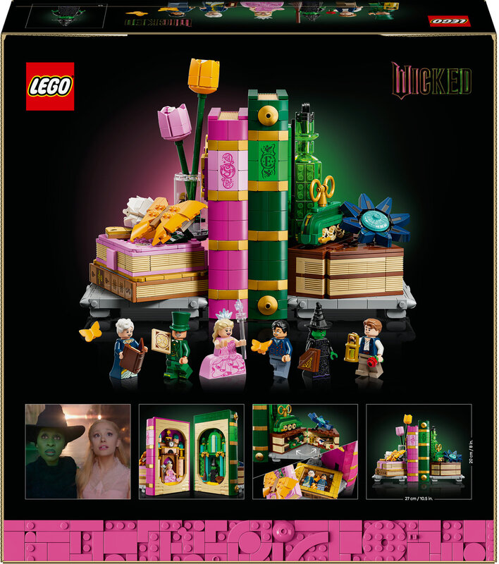- Set de construcție pentru adulți – Suportul de carte cu Glinda ascunde modelul universității Shiz și un jurnal care poate găzdui 2 mini-figurine, iar suportul cu Elphaba include Emerald City și Grimmerie, în care se încadrează Vrăjitorul și Fiyero