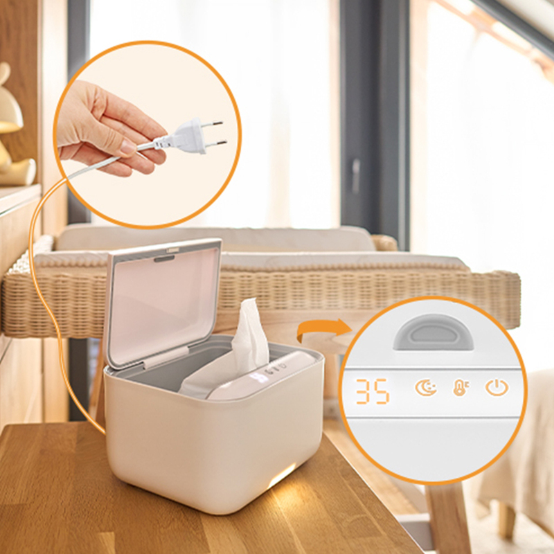 BabyBliss menține temperatura șervețelelor, dar nu le usucă, ceea ce face ca ambalajul clasic să dureze mai mult. În plus, dimensiunea dispozitivului permite păstrarea întregului ambalaj de șervețele – părinții nu trebuie să completeze constant stocurile. Panoul de control tactil, intuitiv, afișează temperatura actuală din interiorul dispozitivului. Lumina nocturnă încorporată facilitează schimbarea scutecului copilului noaptea – lumina blândă permite utilizarea confortabilă a dispozitivului.