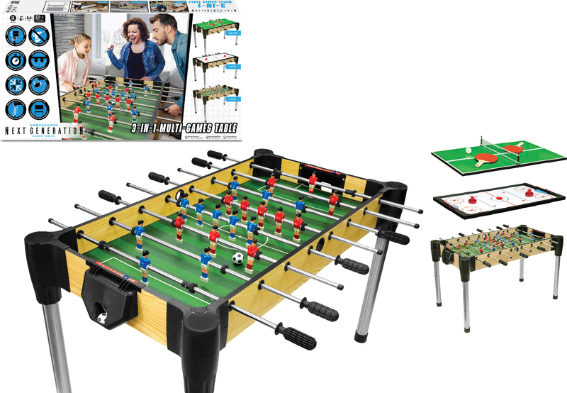 Masă de joc universală oferă trei jocuri de societate populare într-unul: hochei de masă, fotbal de masă și biliard. Datorită dimensiunii compacte de 122 cm, se potrivește atât în gospodării, cât și în sălile de jocuri.