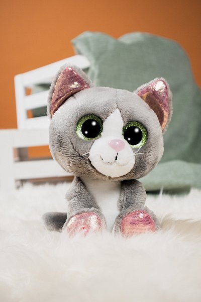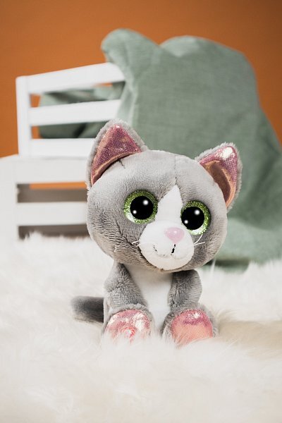 O pisică gri dulce, cu ochi strălucitori și diverse urechi și labe strălucitoare. Seria GREEN a lui Nici folosește aproape exclusiv materiale de pluș și de umplutură din materiale reciclate.