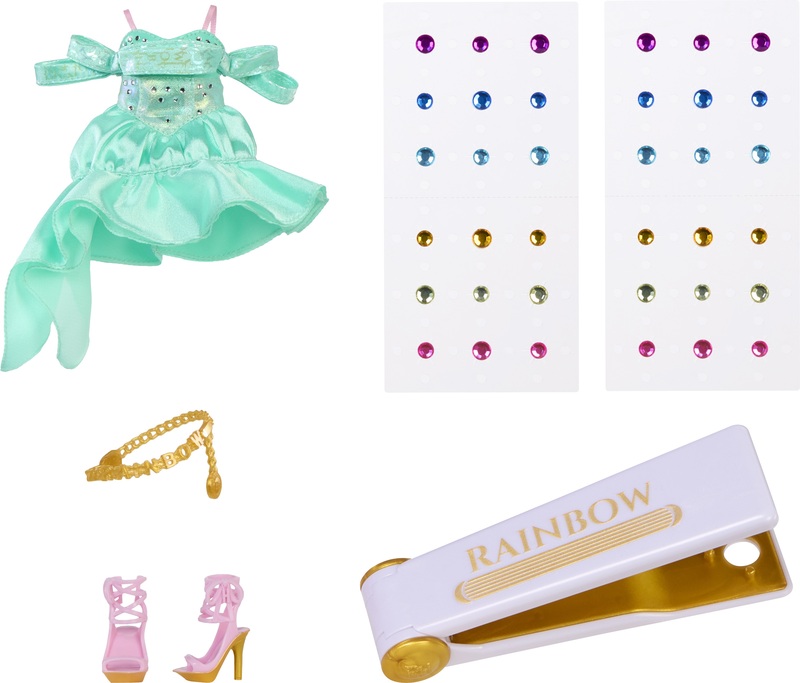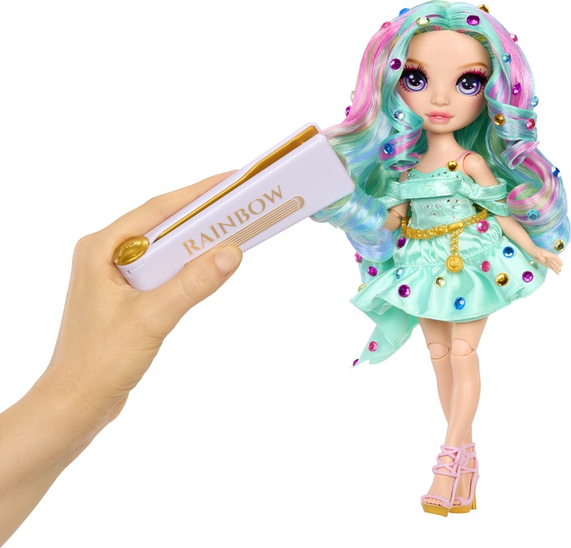 În pachet sunt incluse sclipiciuri cristaline curcubeu, cu care poți decora părul și hainele păpușilor – și poți să le încerci și pe tine. Cu ajutorul instrumentului de ondulare Rainbow High, poți aplica cu ușurință cristalele strălucitoare și transforma fiecare coafură și ținută într-o operă de artă strălucitoare curcubeu.