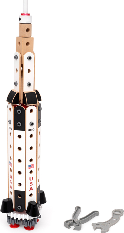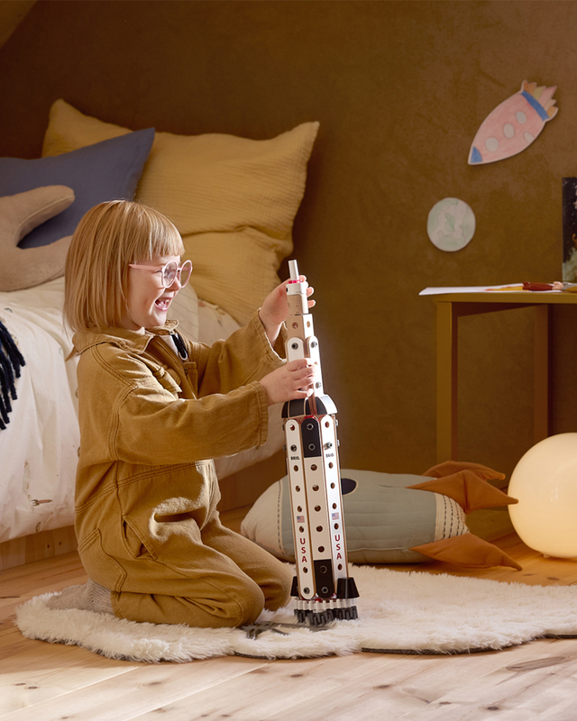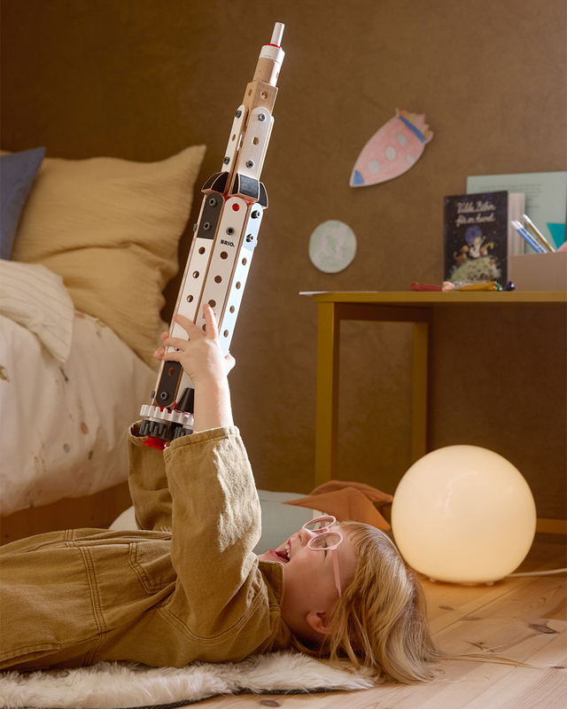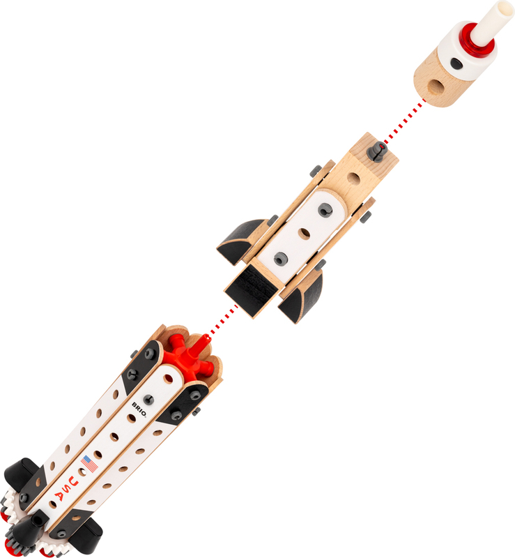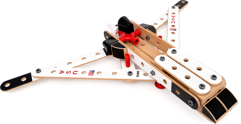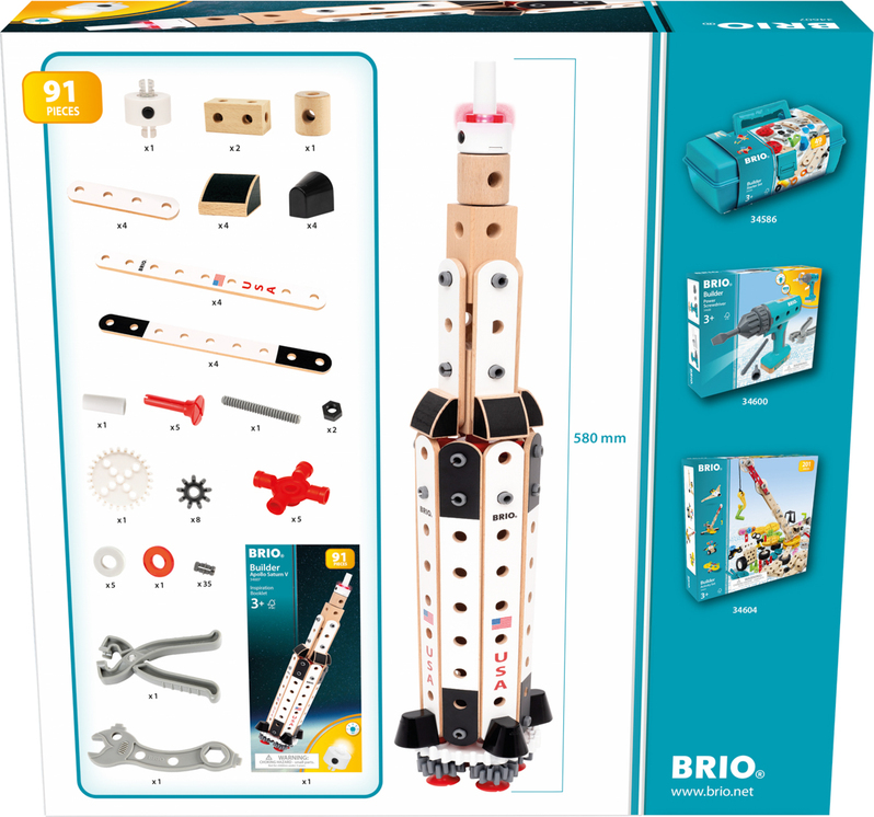 La fel ca toate seturile de construcție BRIO Builder, acest jucărie susține jocul deschis și imaginativ – ideal pentru micii ingineri și exploratori ai spațiului. Builder Apollo Saturn V conține 91 de piese: 12 x profil din lemn, 11 x bloc din lemn, 9 x roată dințată, 5 x cui, 1 x lumină, 1 x clește, 1 x cheie, diverse piese de joc și 1 x broșură inspirațională.