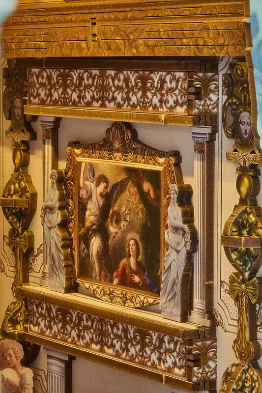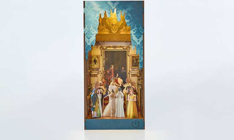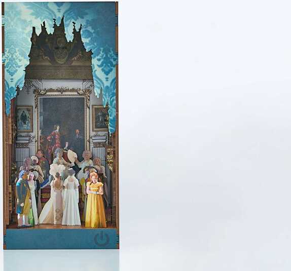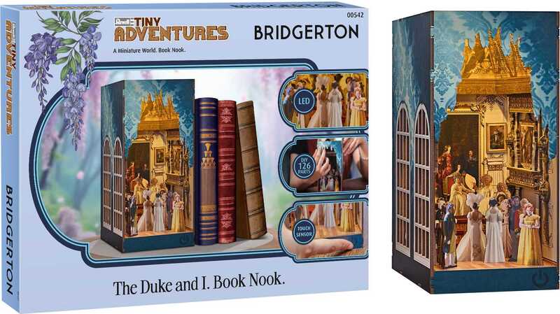 Setul modelului Bridgerton. Dimensiuni: 180 x 110 x 230 cm. Pachetul conține 126 de piese.Privire de ansamblu asupra raftului. Și te afli în mijlocul lumii Bridgerton. Acest colț de cărți prezintă scene din filmul „Ducele și eu” – ca o miniatură tridimensională pe care o poți construi singur. Componente din lemn de precizie, senzor tactil, lumină LED. Funcționează fără cunoștințe anterioare. Se potrivește între cărțile tale.