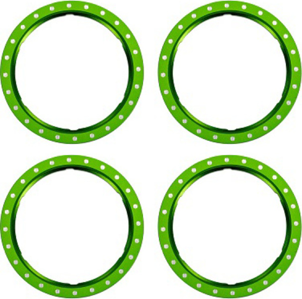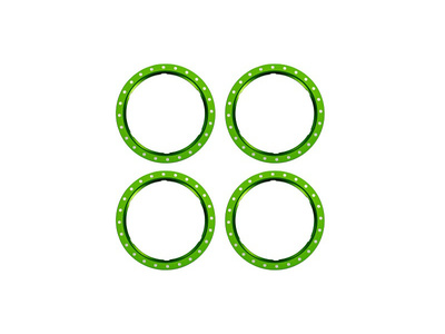Inelul Beadlock din aluminiu Traxxas verde (4), destinat sistemului de roți Pro Scale cu componente modulare ale jantei și anvelope lipite pe inele de nylon auxiliare.