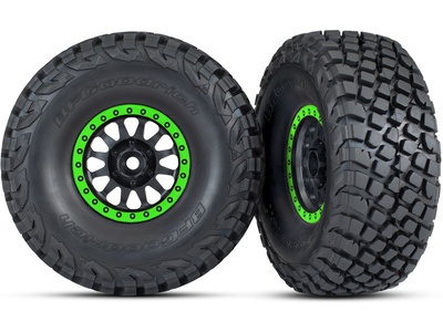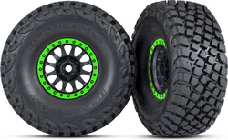 Roți universale complete pentru Traxxas Unlimited Desert Racer. Jante Method Racing în culoare neagră cu jante verzi și anvelope Baja KR3 (2 bucăți în ambalaj).